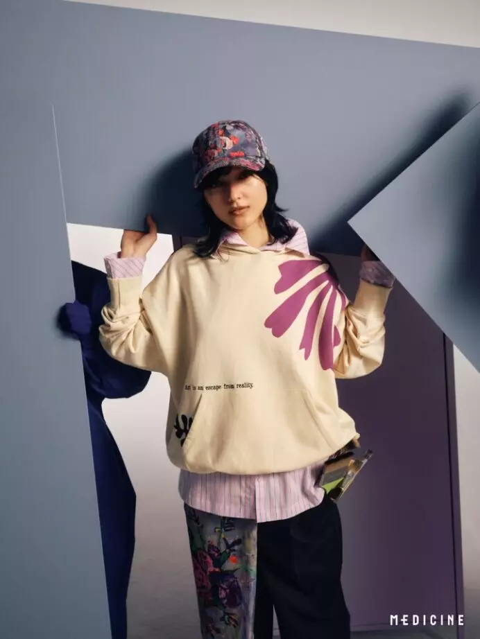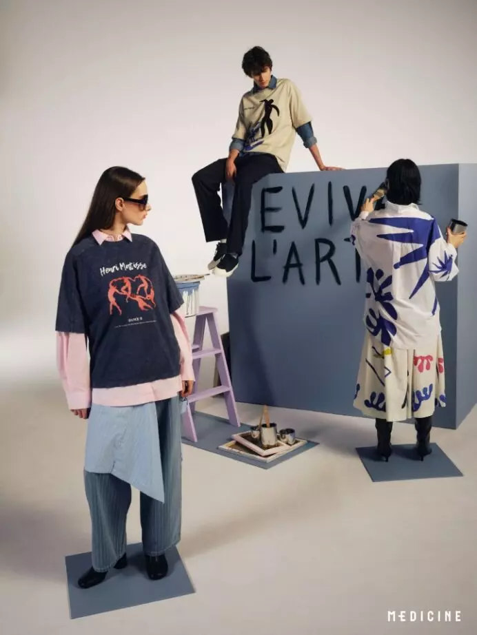 Jest to projekt zakorzeniony w twórczości trzech artystów, których łączy niepokorność, bezkompromisowa szczerość i niezależność od estetycznych norm epok, w których żyli. Eviva L’arte od Medicine scala te trzy odrębne światy w jedną opowieść o sztuce jako akcie niezgody na schemat. Luźne formy, warstwowość, swobodna sylwetka i artystyczny „chaos” tworzą stylizacje, które nie narzucają zasad i pozwalają wyrażać siebie. Wzory na tkaninach czerpią z ekspresyjnego malarstwa i szkiców, pełnych dynamicznych linii, odważnych kontrastów i intensywnego emocjonalnego ładunku. Całość tworzy wizję mody jako manifestu kreatywnej wolności i sprzeciwu wobec konwencji.