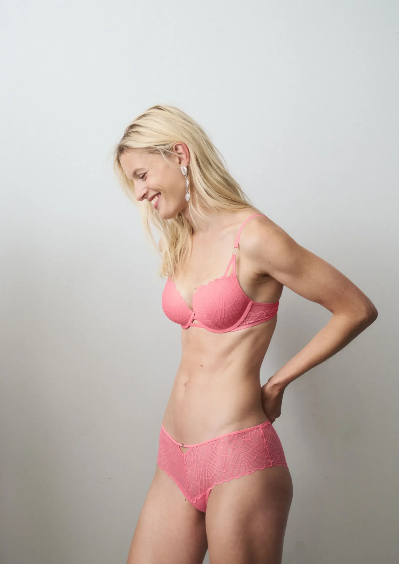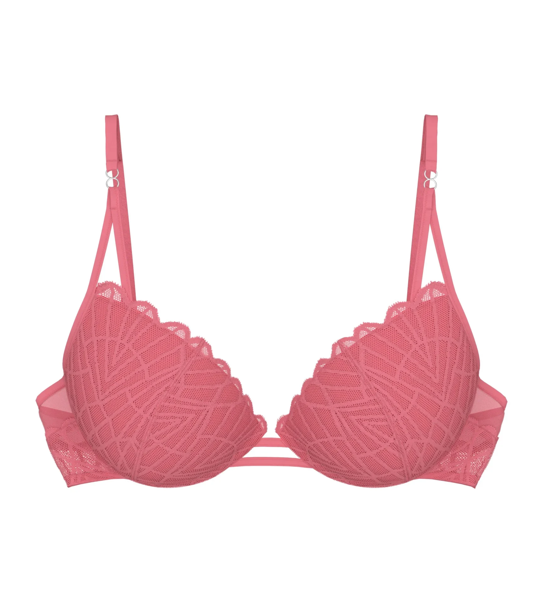 Na pokazach największych domów mody (Chanel. Jil Sander, Altuzarra) biustonosze miały swoje pięć minut. Kolekcja THAT NIGHT IN VEGAS to propozycja dla kobiet, które traktują bieliznę jak modowy manifest i narzędzie wyrażania siebie. Przykład? Biustonosz push-up z graficzną koronką w odcieniu Wild Rose łączy funkcjonalność z atrakcyjnym wyglądem. Mała powierzchnia krycia, głęboki dekolt w połączeniu z lekkimi i elastycznymi fiszbinami Comfort Wire zapewniają +100% do wyrazistości stylizacji przy zachowaniu pełnego komfortu. Z biustonoszem idealnie współgrać będą stringi z tej samej kolekcji.